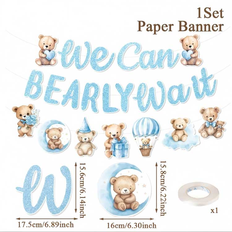 Sünnipäevabänner: 1 bänner/komplekt, 2-3 riputusnööriga riputuskaunistuseks; trükitud "Palju õnne sünnipäevaks" või "Tere tulemast". Beebiteemaline tekst