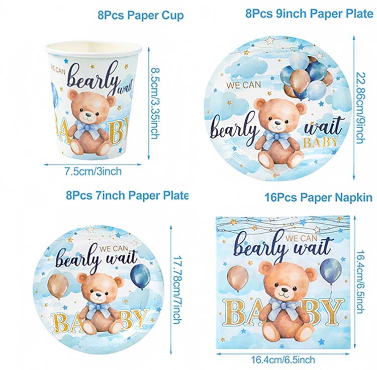 Beebi sünnipäeva ühekordse taldriku komplekti suurus: Toode on pakendatud OPP kottidesse, kuid saadaval on ka paberkaardipakend. Saame kohandada pakendit vastavalt kliendi erinõuetele.
