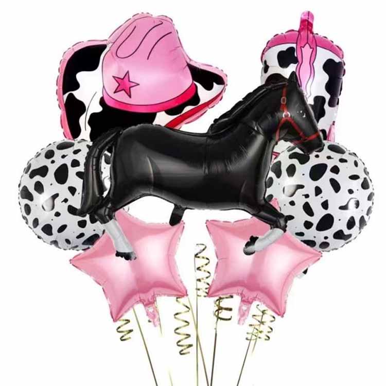 Täpse joonekontuuri ja värvide sobitamisega taastavad need jooksvate hobuste lihaskontuurid ja voolavad lakid ning levinud loomulikud värvilahendused nagu pruun ja must sobivad paremini hobuste tegeliku kuvandiga. Mõned kauboiteemalised fooliumõhupallid lisavad visuaalse mõju suurendamiseks isegi metalseid värve, nagu hõbe ja kuld; lehma muster on ümmargune, sellele on trükitud mustvalged lehmamustrid ja mõned stiilid lisavad ruumilisi kaunistusi, nagu väikesed kellad ja plush sabad alumiiniumfooliumist õhupallide all, mis on nii armsad kui ka maalähedase stiiliga ning on väga populaarne perede kauboitegevuse teema.