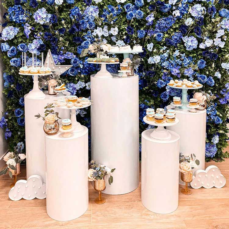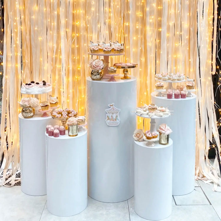 Silindrilise põhjaga magustoidulaud toimib nii anuma kui ka ornamentina. Tavaliselt on neid erinevates kombinatsioonides: 3-osalised, 5-osalised, 7-osalised jne. Kõige tavalisem kombinatsioon on viis tükki. Erineva suurusega sõltumatuid silindrilisi torusid saab paindlikult paigutada ja need on stseeni oluline osa. Samal ajal pakume ka kohandamist suuruse ja kuju järgi. Veelgi enam, need sobivad teie peokaunistustega.