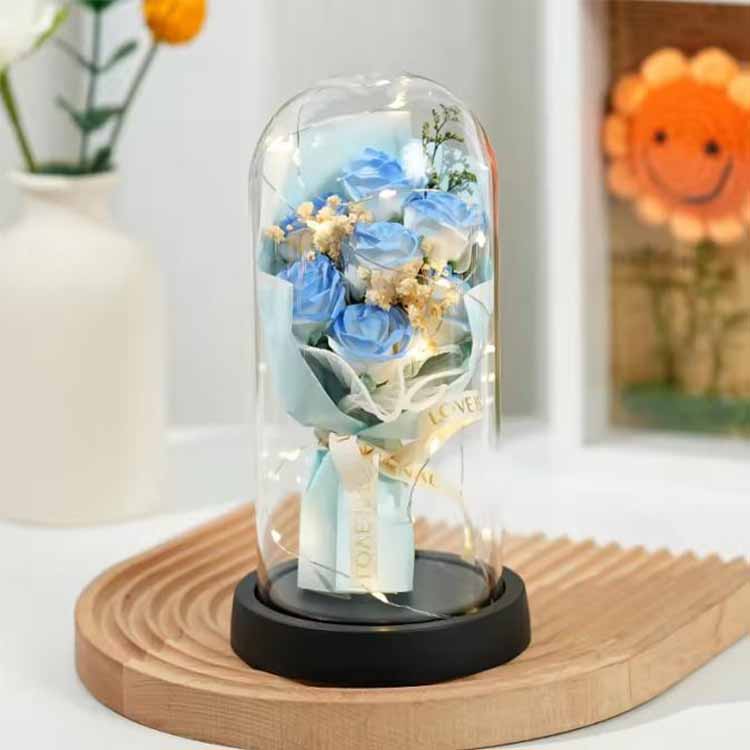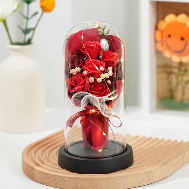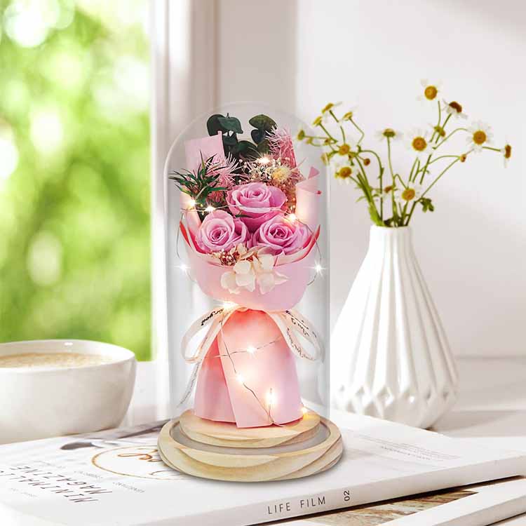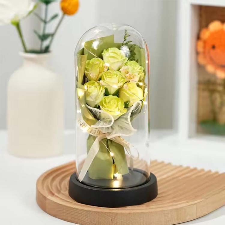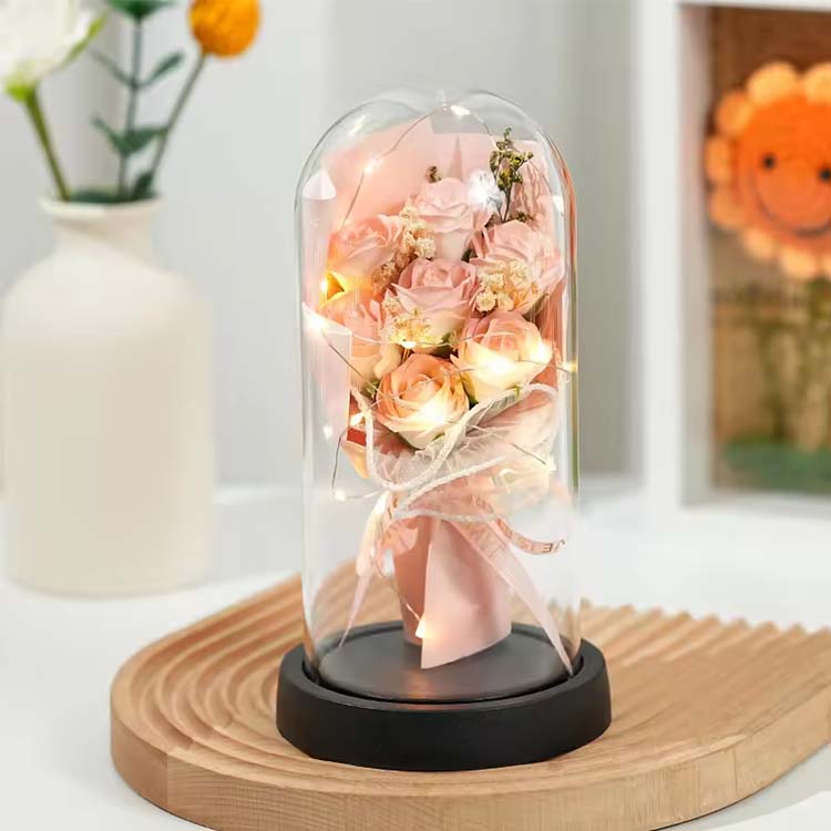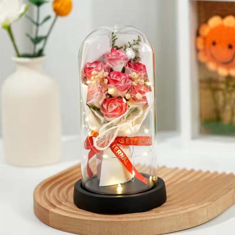 LED-ga klaaskupliga seebikimpu kasutatakse koos seebilillede ja konserveeritud lilledega.LED-valgustid kasutavad sooja ja mittepeegeldavat valgust, mis võib stseenide kaunistamisel lisada sooja atmosfääri. Sisseehitatud LED-valgusnööril on ka värvilised vilkuvad tuled ja värve saab kohandada vastavalt teie vajadustele. Seda klaaskattega kimpu saab kasutada ka näiteks sünnipäevade, stseenide, stseenide, jne. antakse kui a kingitus.Igavesed lilled ei närbu ega muuda värvi isegi klaaskattega. Seebililli saab kasutada ka käte pesemiseks või lõhnaainena. See roosikimp on ökonoomne ja praktiline.