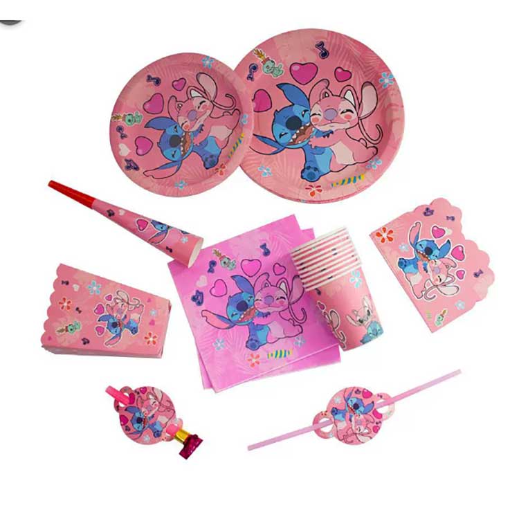 Stitch ühekordse kasutusega taldrikukomplekt sisaldab järgmisi tooteid: 7-tollised taldrikud (10tk/kott), 9-tollised taldrikud (10tk/kott), salvrätikud (20tk/kott), vimplid (10tk/kott), tagastatavad kinkekotid (10tk/kott), popkornikarbid (6tk/kott), paberkübarakarbid (6tk/kott), gg (6tk/kott), pabertopsid (10tk/kott), sarved (6tk/kott), kõrred (10tk/kott), kutsekaardid (10tk/kott), maskid (10tk/kott), lusikad, söögiriistad (10tk/kott) ja laudlina (1tk/kott). Komplektis on 17 erinevat tootetüüpi. Kliendid saavad valida, kas ostavad kogu komplekti või valida oma vajaduste rahuldamiseks ainult osa esemetest.
